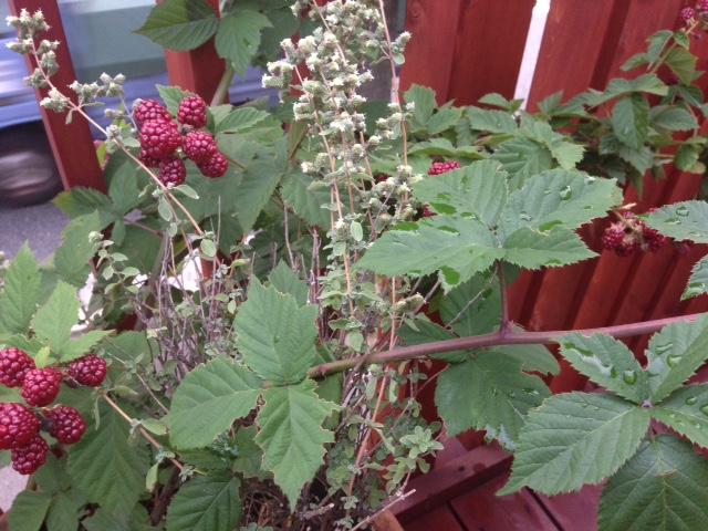 ウッドデッキのブラックベリーもたわわに実りました。無農薬です。ご試食どうぞ。